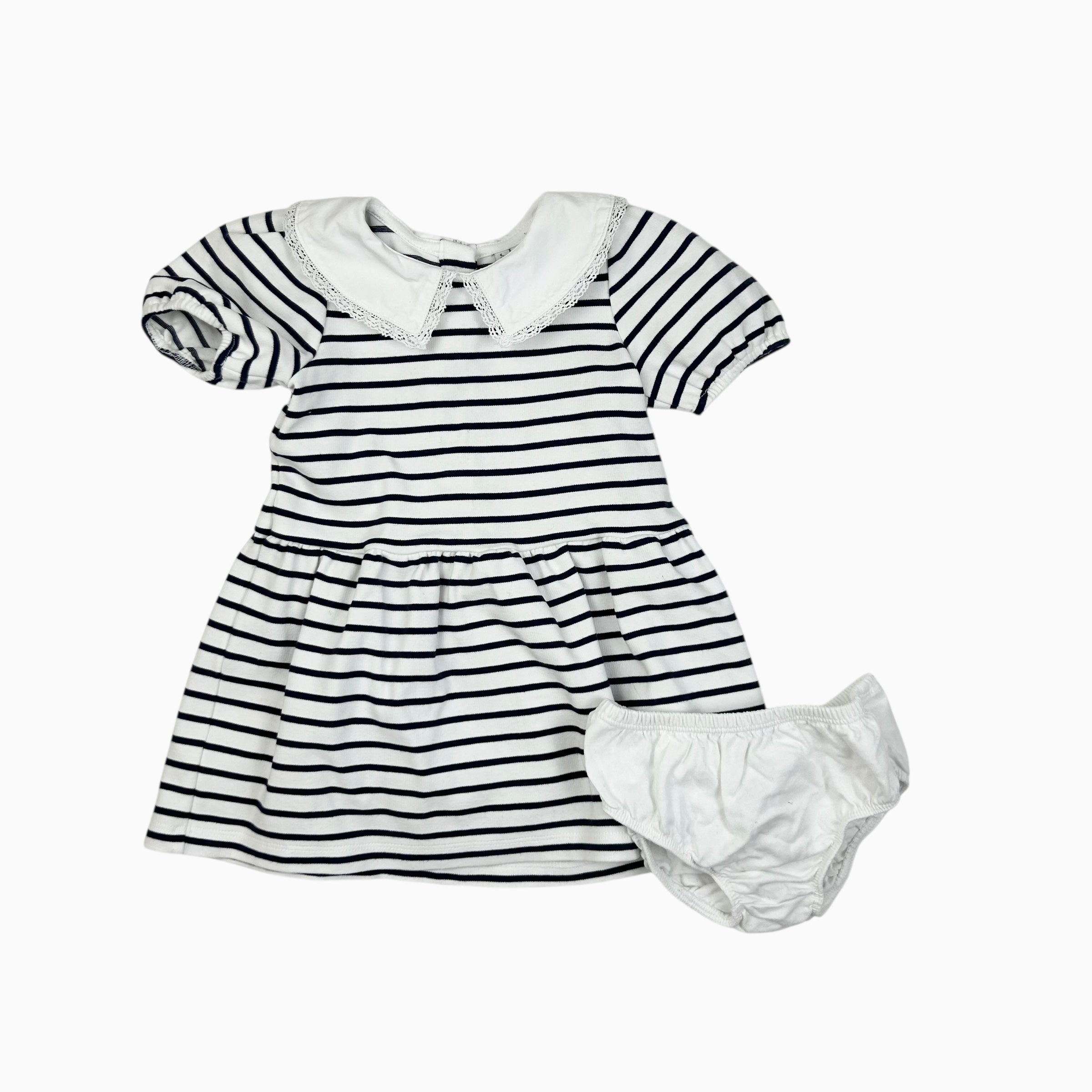 Robe à col claudine à rayures marine avec bloomer blanc 12-18M