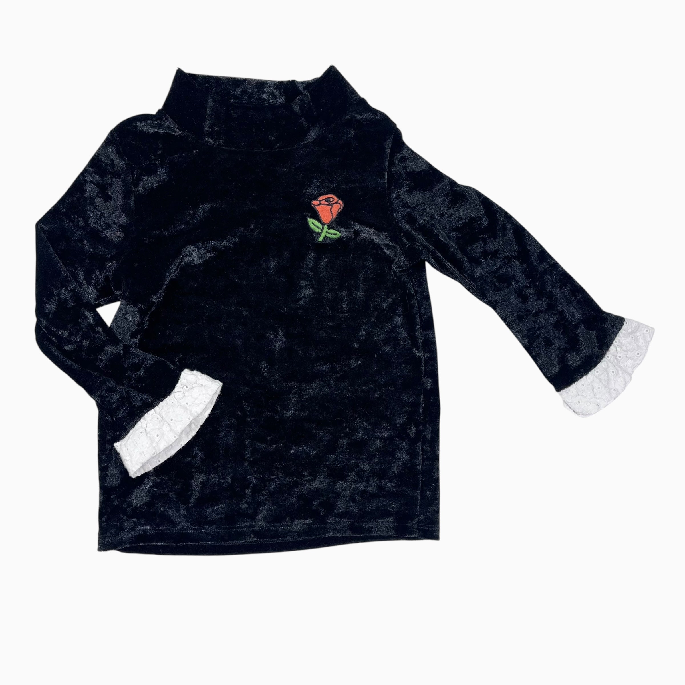 Haut noir à col mock en velours avec écusson de roses et broderie anglaise 6-7Y