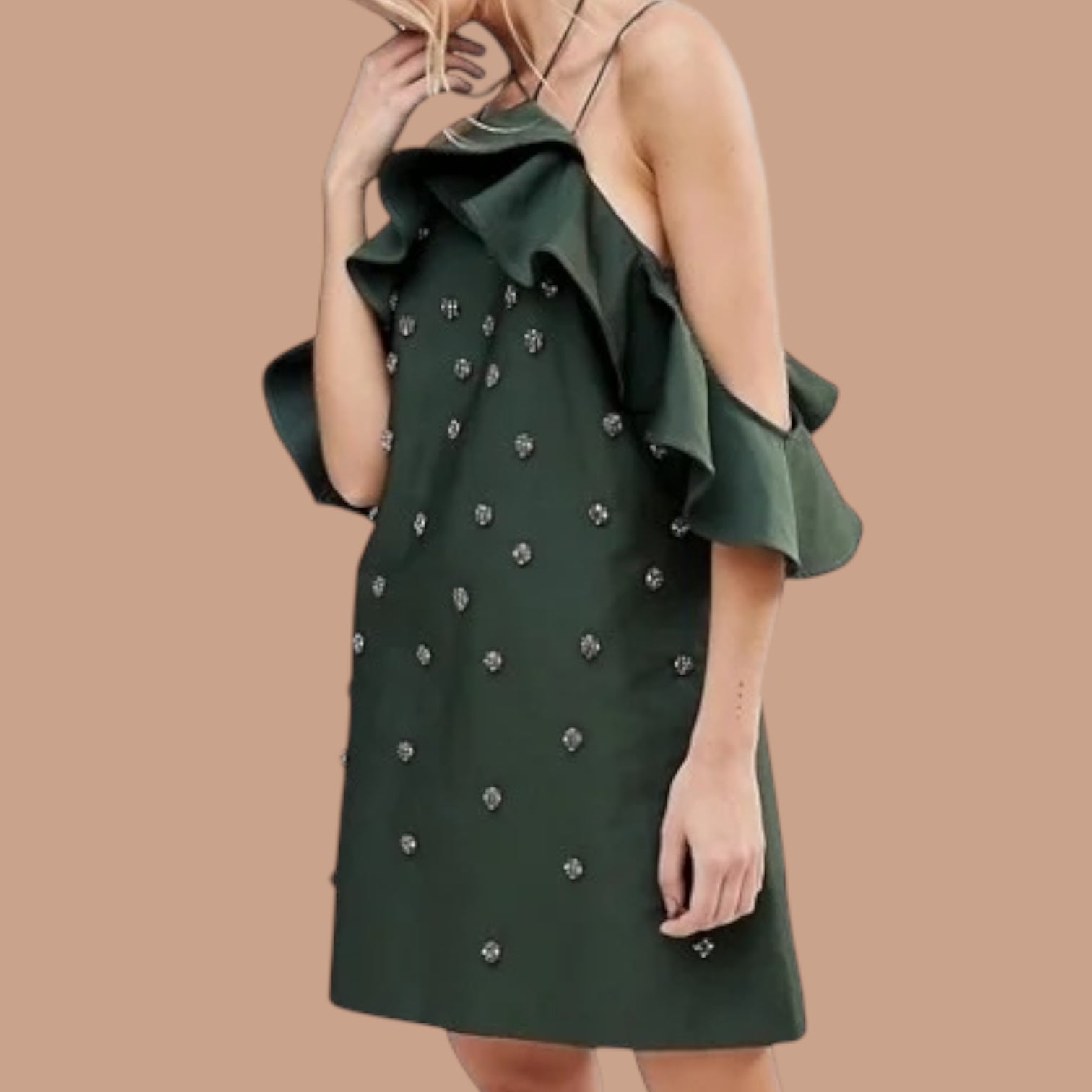 Robe mini olive avec perles poly,coton etnylon pour femmes S